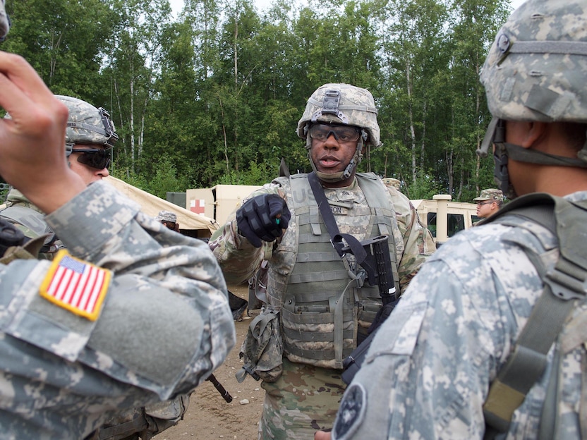 Sgt. Tremaine Jackson, a squad leader with the 95th Chemical Company, briefs his fire team before maneuver training Aug. 17, 2017, at Joint Base Elmendorf-Richardson's Infantry Squad Battle Course. The company plans to build on the training in the future with squad and platoon training.