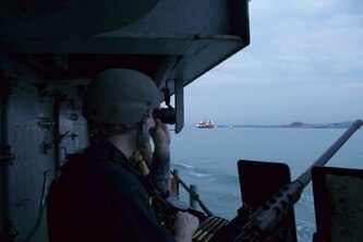 In this file photo, culinary Specialist 2nd Connor Bowman, assigned to the amphibious dock landing ship USS Pearl Harbor (LSD 52), stands watch on the ship’s starboard wing while transiting the Singapore Strait, Aug. 15, 2017. Pearl Harbor is part of the America Amphibious Ready Group, which is operating in the Indo-Asia Pacific region to strengthen partnerships and serve as a ready response force for any type of contingency.
