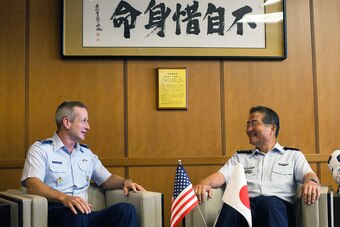 U.S. Air Force Gen. Terrence J. O'Shaughnessy, Pacific Air Forces commander, speaks with Japan Air Self-Defense Force Chief of Staff, Gen. Yoshiyuki Sugiyama at the Japan Ministry of Defense, Aug. 30. Personal meetings are a valuable part of the U.S.-Japan alliance.