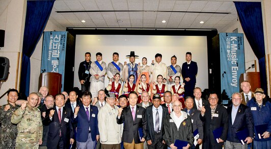 After the pinning ceremony, Vietnam Veterans from the U.S. and Korean K-Music Envoy team and USAG Daegu Command Group take a group photo as a respect for the dedicated service and representation of U.S. and Korea Alliance, Nov. 3, at Camp Henry Theater.