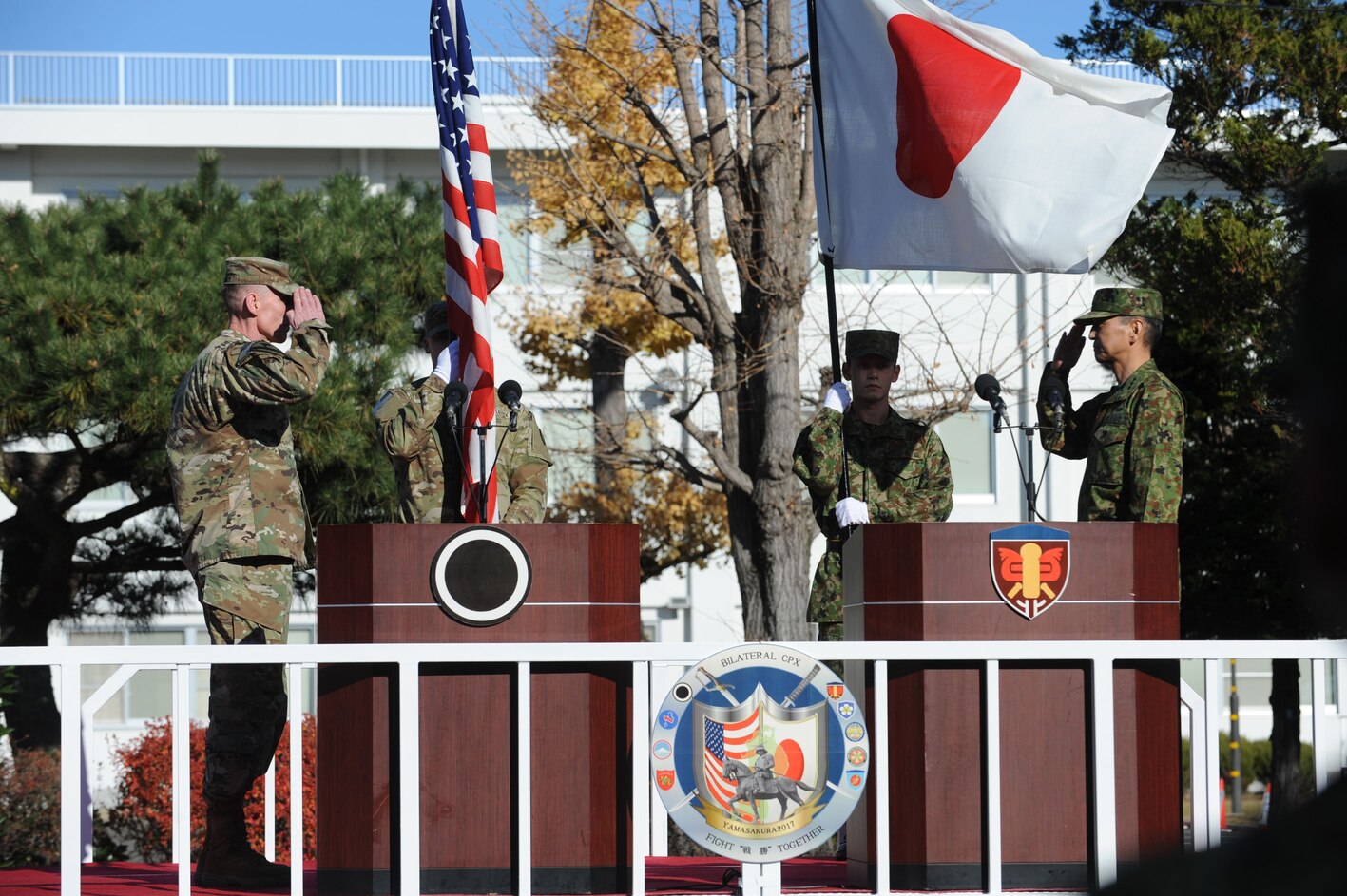 Army Lt. Gen. Gary J. Volesky, commander, Army I Corps, Joint Base Lewis-McChord, Washington, and Lt. Gen. Tetsurō Yamanoue, commanding general of the Northeastern Army, Japan Ground Self-Defense Force (JGSDF), salute each other during the opening ceremony of Yama Sakura. Yama Sakura is an annual bilateral command post exercise involving the U.S. Military and the Japan Ground Self-Defense Force (JGSDF).The purpose of the exercise is to enhance U.S. and Japanese combat readiness and interoperability while strengthening bilateral relationships and demonstrating U.S. resolve to support the security interests of allies and partners in the Indo-Asia-Pacific region. During the exercise, U.S. military members and JGSDF members exchange ideas, tactics, techniques, military experiences, and culture.