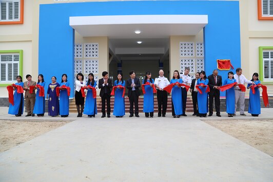 Distinguished guests mark the opening of a U.S. funded kindergarten in Lien Thuy, Vietnam, with a ribbon-cutting ceremony, Dec. 7, 2017. The new regional, ten-room kindergarten can support the education of 320 children and doubles as a storm shelter as the region is prone to torrential rains and flooding. U.S. Pacific Command has built 20 schools in Vietnam since 2009 using Overseas Humanitarian, Disaster, and Civic Aid funds.