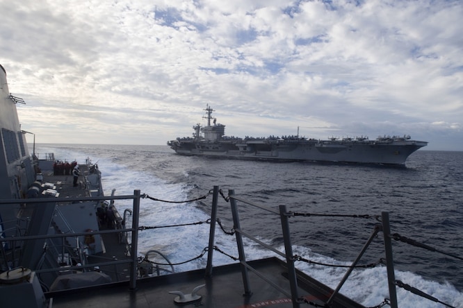 In this file photo, the Arleigh Burke-Class guided-missile destroyer USS Michael Murphy (DDG 112) breaks away from the Nimitz-class aircraft carrier USS Carl Vinson (CVN 70), Nov. 6, 2017. Michael Murphy is participating in a sustainment training exercise in preparation for an upcoming deployment.