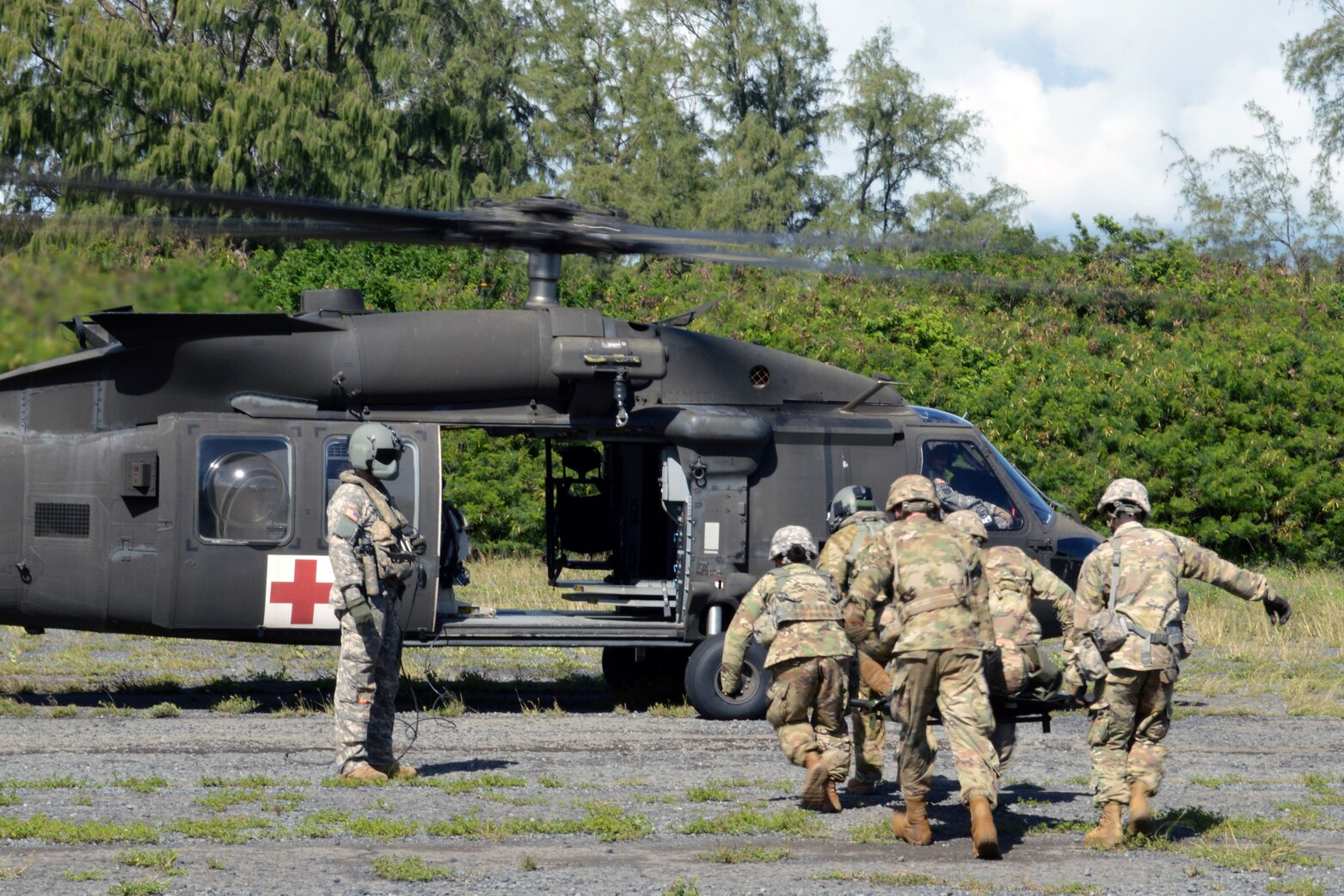 Combat medics assigned to the 29th Brigade Engineer Battalion, 3rd Brigade Combat Team, “Broncos,” 25th Infantry Division, carry a simulated casualty toward a UH-60 Black Hawk helicopter for medical evacuation training at Marine Corps Training Area Bellows, Hawaii, Jan. 10, 2018. The use of the Black Hawk while idling in place added a realistic aspect to the training. Marine Corps photo by Staff Sgt. Armando R. Limon