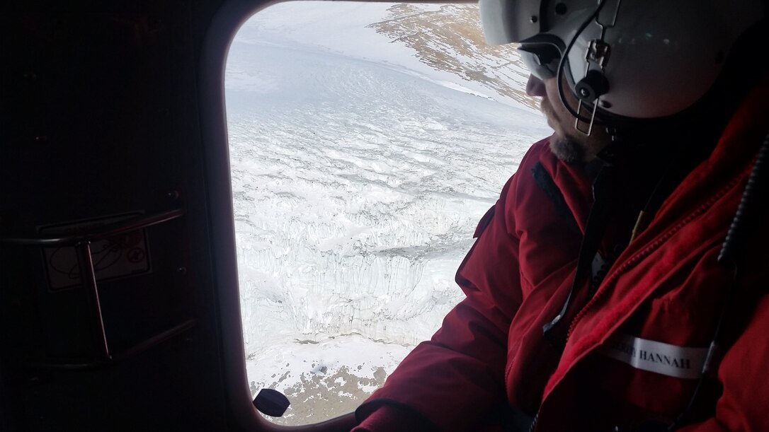 Staff Sgt. Jeremy Hannah, a geophysical maintenance supervisor with the Air Force Technical Applications Center, Patrick AFB, Fla., peers out the window of a Bell 212 helicopter as it flies over Antarctica. Hannah and five other members of the nuclear treaty monitoring center made the trek from Florida to Antarctica to conduct annual maintenance, troubleshoot, and replace seismometers that contribute to the International Monitoring System. (U.S. Air Force photo by Brian Fox)