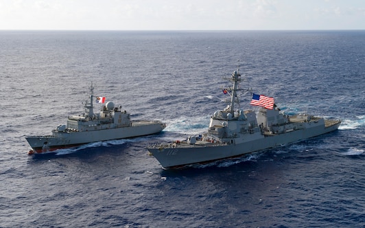 The guided-missile destroyer USS Michael Murphy (DDG 112) and the French frigate FNS Vendemiaire sail in formation during a passing exercise (PASSEX), Jan. 29, 2018. Michael Murphy is currently operating in the Pacific as part of the Carl Vinson Strike Group.