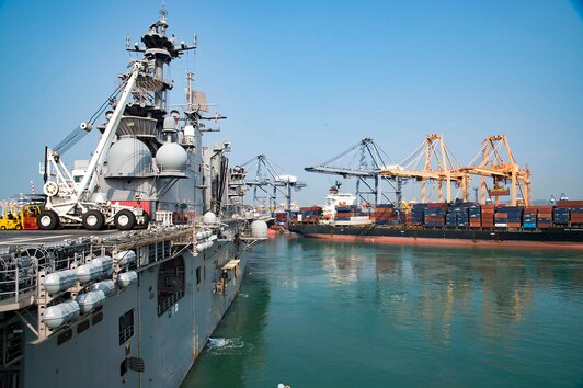 The amphibious assault ship USS Bonhomme Richard (LHD 6) departs Laem Chabang, Thailand, following a scheduled port visit. Bonhomme Richard is operating in the Indo-Pacific region as part of a regularly scheduled patrol and provides a rapid-response capability in the event of regional contingency or natural disaster.