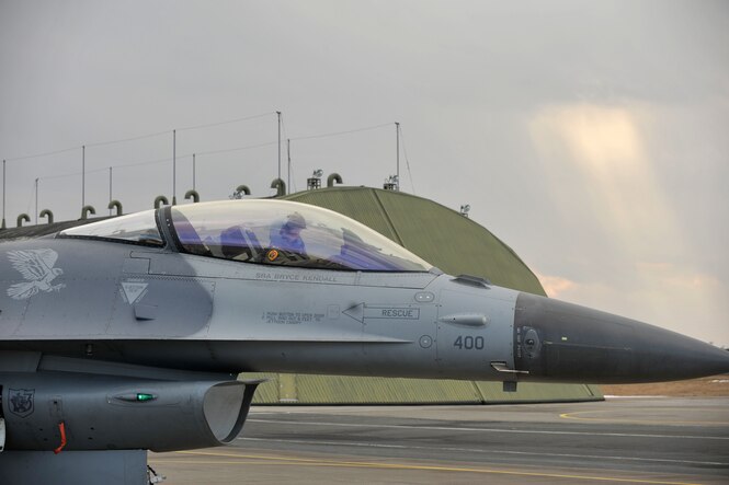 U.S. Air Force Capt. DeWulf, the 13th Fighter Squadron bravo flight commander, taxis in an F-16 Fighting Falcon tail number 400 at Misawa Air Base, Japan, Jan. 18, 2018. Despite being grounded for 450 days, the 35th Maintenance Squadron used this experience as a training opportunity to hone skills that are not typically executed during daily maintenance operations.