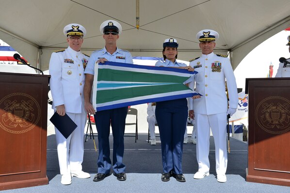 Coast Guard Vice Adm. Fred Midgette, Pacific Area Commander, and Capt. Steven Whittrock, Coast Guard Cutter Sherman’s commanding officer, stand with Sherman crewmembers after Midgette awarded the cutter with the meritorious unit commendation during the Sherman’s decommissioning ceremony in Honolulu, Mar. 29, 2018. Sherman crewmembers conducted their final patrol in the Bering Sea and overcame a multitude of engineering challenges without missing a single operational day during the patrol.