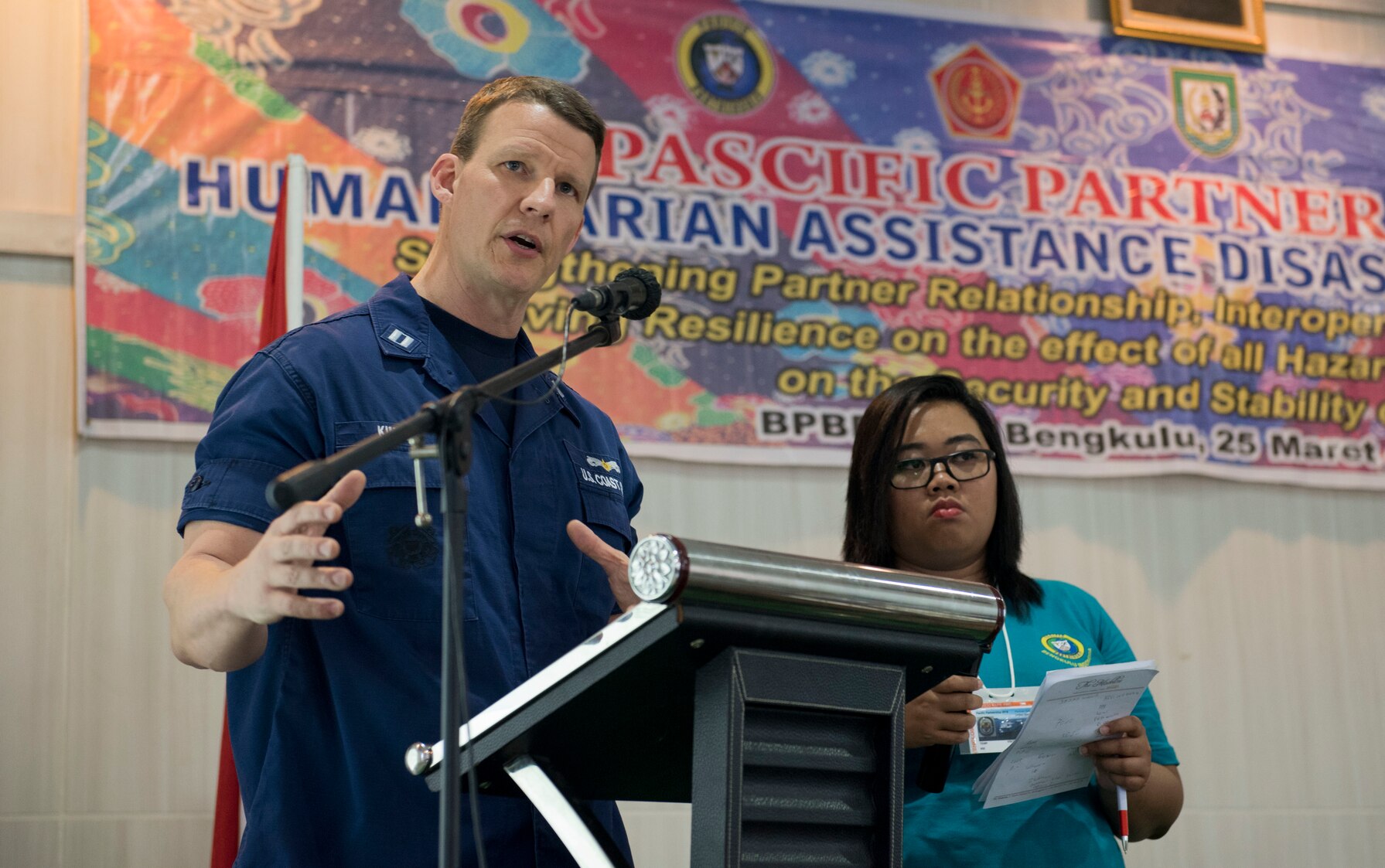 Lt. Christopher Kimrey delivers a presentation during a humanitarian assistance and disaster relief (HADR) seminar in Bengkulu, Indonesia as a part of Pacific Partnership 2018 (PP18). PP18’s mission is to work collectively with host and partner nations to enhance regional interoperability and disaster response capabilities, increased stability and security in the region, and foster new and enduring friendships across the Indo-Pacific Region. Pacific Partnership, now in its 13th iteration, is the largest annual multinational humanitarian assistance and disaster relief preparedness mission conducted in the Indo-Pacific.