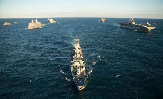 In this file photo, Royal Australian Navy, Royal New Zealand Navy and U.S. Navy ships steam in formation during exercise Talisman Sabre 2015.