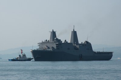 The amphibious transport dock ship USS Green Bay (LPD 20), assigned to the Wasp Expeditionary Strike Group, arrives in Sasebo after completing a routine patrol in the Indo-Pacific region with the 31st Marine Expeditionary Unit.