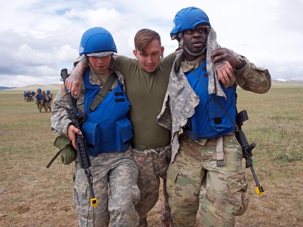 Alaska Army National Guard Spc. Dana Haddox and Spc. Jahmoi Hodge, both members of the platoon representing the 297th Regional Support Group, evacuate simulated casualty U.S. Navy Hospital Corpsman 3rd Class John Bustamonte, III Marine Expeditionary Force, June 17, 2018, during Tactical Combat Casualty Care training at Five Hills Training Area, Mongolia, as part of Khaan Quest 2018. The purpose of Khaan Quest is to gain United Nations training and certification for the participants through the conduct of realistic peace support operations, to include increasing and improving UN PKO interoperability and military relationships among the participating nations.