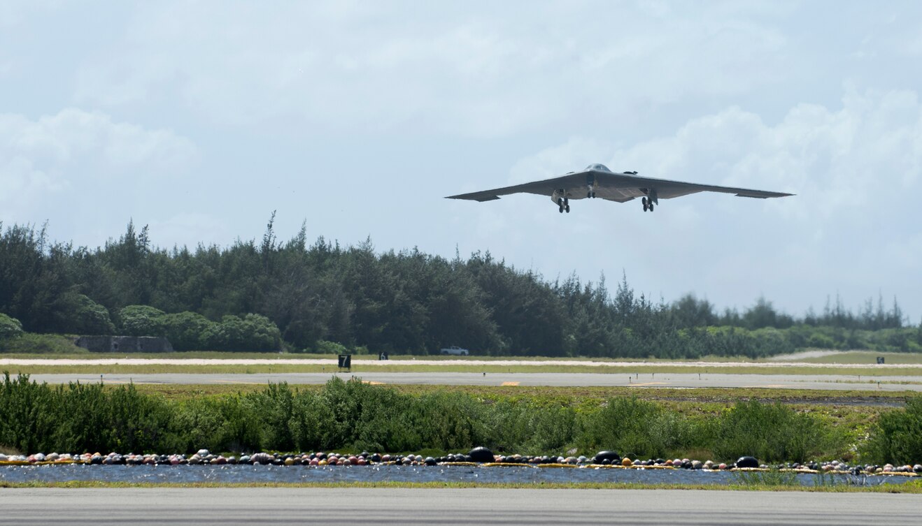 U.S. Air Force B-2 Spirit deployed from Whiteman Air Force Base, Missouri, takes off from Wake Island Airfield Sept. 14, 2018. The B-2 conducted hot-pit refueling, a technique in which aircraft land and refuel without shutting down their engines. These missions showcase the U.S. forces’ ability to address a global security environment and demonstrates U.S. commitment to a free and open Indo-Pacific.