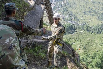 Lt. Col. Andrew Steadman, the 1st Battalion, 23rd Infantry Regiment commander, prepares to descend down a cliff during a rappel and zipline class Sept. 20, 2018, at Chaubattia Military Station, India. This was part of Yudh Abhyas, an exercise that enhances the joint capabilities of both the U.S. and Indian army through training and cultural exchange, and helps foster enduring partnerships in the Indo-Asia Pacific region.