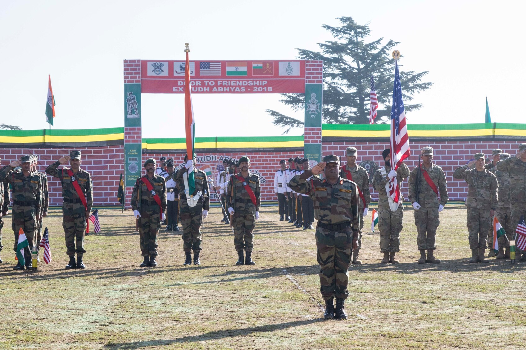 Color guards with the U.S. and Indian armies bear their respective nations’ colors during the Yudh Abhyas closing ceremony at Chaubattia Military Station, India, Sept. 29, 2018. The bilateral exercise was geared toward enhancing cooperation and coordination between the two nations’ armies through training and cultural exchanges.