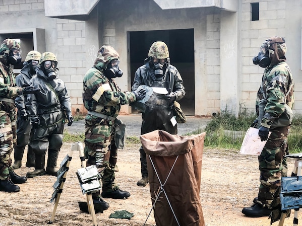 U.S. Airmen from the 18th Civil Engineer Squadron and Japan Self Defense Force service members from 15th Nuclear, Biological, Chemical Company, conduct detailed troop decontamination on Combat Town, Camp Hansen, Oct. 10, 2018. The training event is part of a two-day CBRN exercise built upon previously joint/bilateral field training exercises designed to increase combat readiness and interoperability of U.S. forces and the Japan Self Defense Forces.