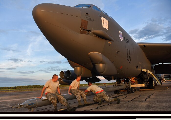 U.S. Air Force members from the 96th Expeditionary Aircraft Maintenance Unit shake a tow bar to maneuver it into place on a B-52 Stratofortress bomber during exercise Lightning Focus at Royal Australian Air Force (RAAF) Base Darwin, Australia, Nov. 29, 2018. Two bombers along with aircrew and support personnel deployed to RAAF Darwin to enable the U.S. to train and increase interoperability with Australian counterparts in support of U.S. Indo-Pacific Command’s Enhanced Air Cooperation (EAC) program. The EAC comprises a range of air exercises and training activities designed to enhance regional cooperation, coordination and interoperability between Australian and U.S. service members.