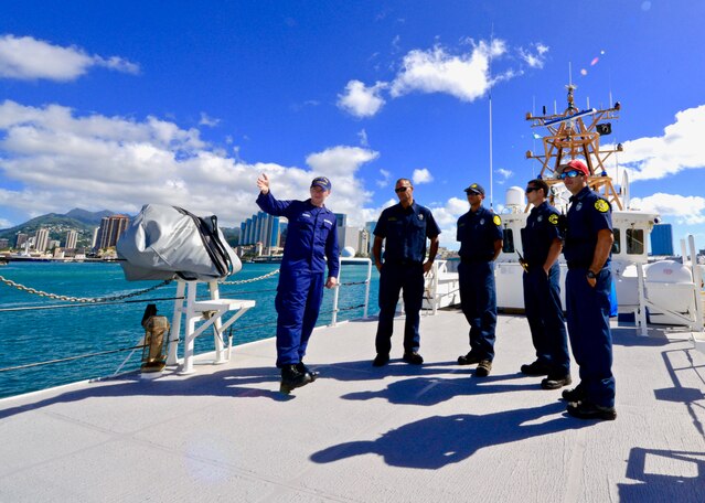 Lt. j.g. Peter Driscoll, executive officer, Coast Guard Cutter Oliver Berry (WPC 1124) describes the cutter's capabilities to members of the Honolulu Fire Department, during a resource sharing event at Base Honolulu Nov. 28, 2018, part of a successful two-day search and rescue exercise. On day one of the exercise, a group of about 40 members from Coast Guard Sector Honolulu, Honolulu City and County Fire Department, Ocean Safety and the Honolulu Police Department to discuss safety, strategy, communication and demonstrate assets to understand each other's capabilities followed by a multi-agency search and rescue live exercise Nov. 29, searching for a simulated lost person in the water off the West Side of Oahu.