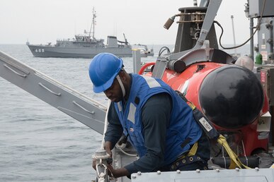 Mineman 3rd Class Latron Jolly, from Hayward, California, removes safety lines in preparation to launch a mine neutralization vehicle aboard the Avenger-class mine countermeasures ship USS Chief (MCM 14) during Mine Warfare Exercise 3JA. The U.S. Navy, Japan Maritime Self-Defense Force and Royal Australian Navy are participating in the exercise to increase proficiency in mine countermeasure operations.