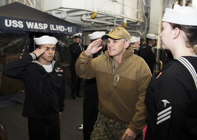 Vice Adm. Phil Sawyer, the U.S. 7th Fleet commander, visits crew members aboard the amphibious assault ship USS Wasp (LHD 1), Jan 9, 2018, during a waterfront visit to forward deployed naval forces operating out of Fleet Activities Sasebo, Japan. Sawyer made the visit to Sasebo to thank the crews for their hard work as well as to hear directly from the crews operating in the 7th Fleet.
