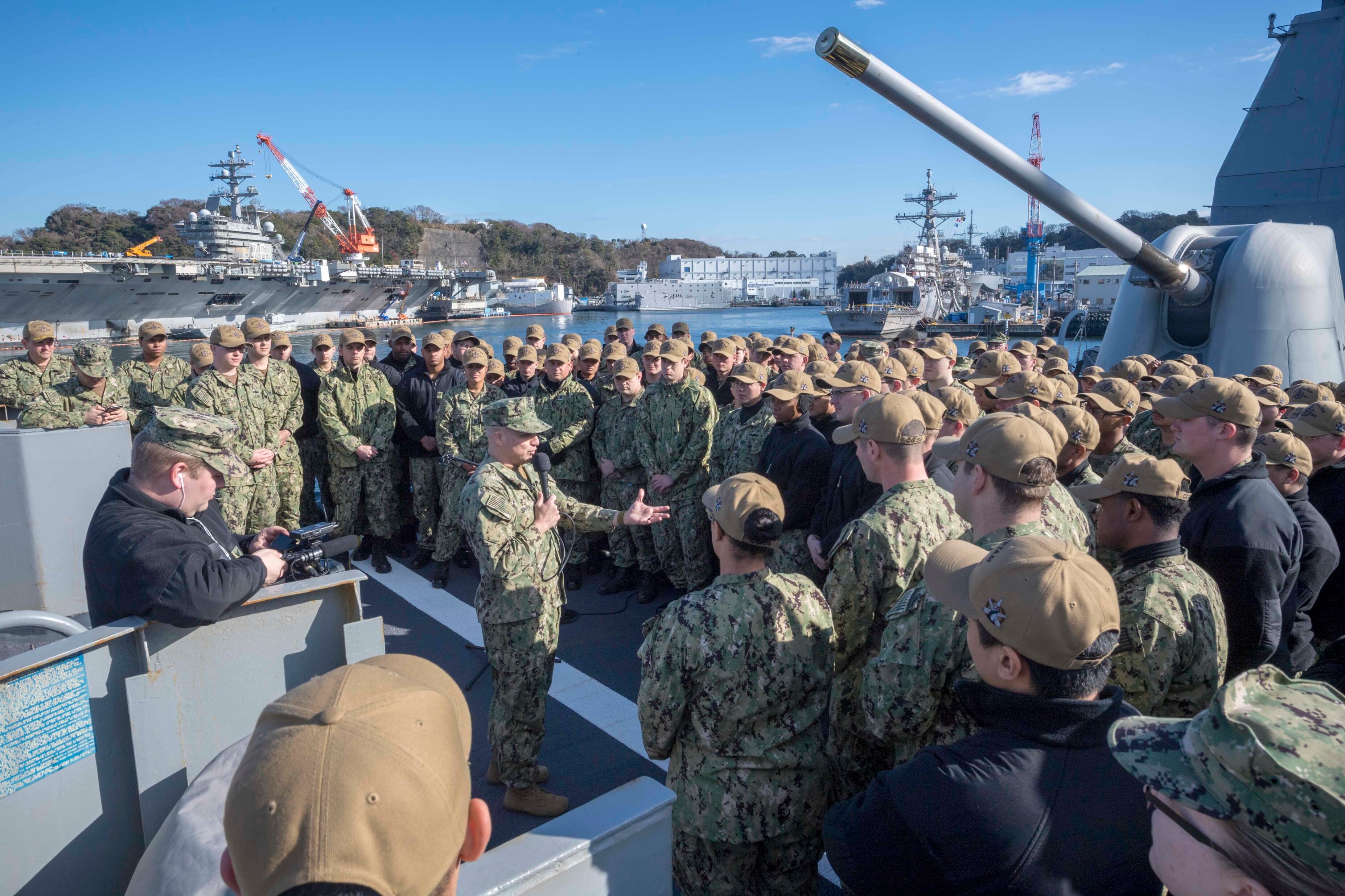 Master Chief Petty Officer of the Navy (MCPON) Russell Smith answers questions from Sailors assigned to the guided-missile cruiser USS Antietam (CG 54) in Yokosuka, Japan during an all hands call. MCPON is the highest enlisted leader in the Navy and was sent to collect Sailors' and enlisted leaders' insights on their challenges in the 7th Fleet to maintain a war fighting readiness. This is the MCPON's first visit to Commander, Fleet Activities Yokosuka as the U.S. Navy's 15th Master Chief Petty Officer of the Navy.