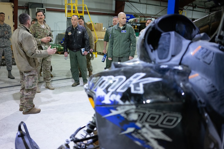 Senior officers from Air Combat Command tour the 176th Wing Arctic Sustainment Package during their Feb. 12, 2019, visit to Joint Base Elmendorf-Richardson, Alaska. The ASP is a rapidly deployable air-droppable package, including combat rescue officers and pararescuemen, that can provide shelter, heat, transportation, fuel and food for 28 people for several days in extreme Arctic conditions.