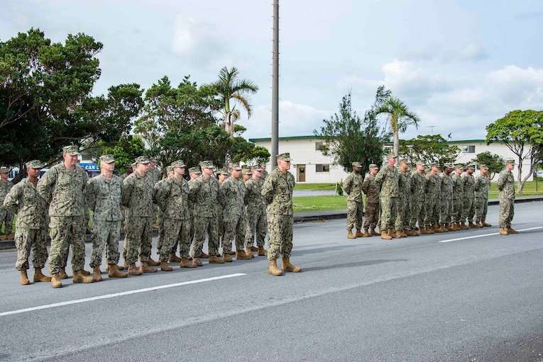 Seabees assigned to Naval Mobile Construction Battalion (NMCB) 3 and NMCB-4 stand at parade rest during a Relief in Place/Transfer of Authority ceremony at Camp Shields in Okinawa, Japan, in which NMCB-4 received authority of the camp from NMCB-3. Seabees are the expeditionary engineering and construction experts of the Naval service. They provide task-tailored, adaptable and combat-ready engineering and construction forces that deploy to support Navy objectives globally.
