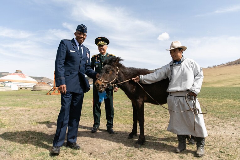 Gen. CQ Brown, Jr., Pacific Air Forces commander, received the traditional gift of a horse from the Mongolian Air Force Command during a visit to the Chingisiin Huree camp south of Mongolia's capital, Ulaanbaatar, May 14. Brown had the honor of naming the horse, to remain in country to exemplify the enduring relationship between the two nations and two air forces. In tribute to his home state of Texas and the state from which he now serves, Hawaii, the general named the young horse, “Lone Star Koa.” Koa is Hawaiian for warrior.