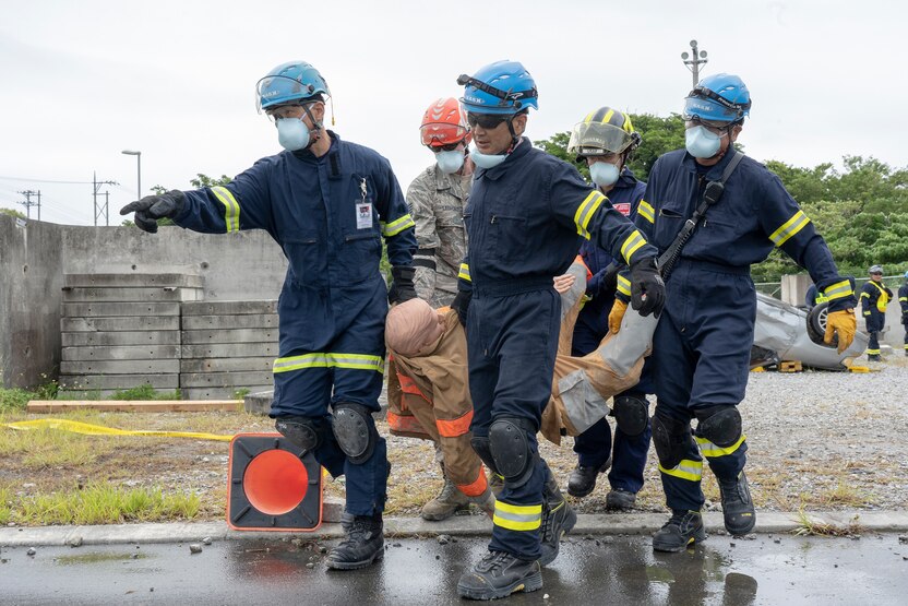 Marine Corps Installations Pacific Fire and Emergency Services simulate carrying out a patient May, 29, 2019 at Camp Hansen, Okinawa, Japan. MCIPAC Fire and Emergency Services trained alongside Kadena Fire Department Rescue Technicians and Navy Corpsman from the U.S. Naval Hospital Okinawa to engage scenarios of possible terrorism and, or, structural collapse due to the environmental elements presented on Okinawa.