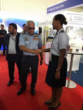 Maj. Chyteira Dues, Washington National Guard Malaysian Bilateral Affairs Officer, greets General Tan Sri Dato’ Sri Hj Affendi bin Buang, the Royal Malaysian Air Force Chief, during the Langkawi International Maritime and Aerospace Exhibition in Malaysia March 2019.