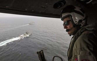 Gunnery Sgt. Tyler Webb from Mansfield, Texas observes as San Antonio-class amphibious transport dock ship USS John P. Murtha (LPD 26), back left,, steams alongside Rajput-class destroyer INS Ranvijay (D55) during a photo exercise. John P. Murtha is currently on its first deployment and part of the Boxer Amphibious Ready Group (ARG) and the 11th Marine Expeditionary Unit (MEU) team and is deployed to the 7th Fleet area of operation to support regional stability, reassure partners and allies, and maintain a presence postured to respond to any crisis ranging from humanitarian assistance to contingency operations.