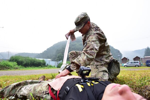 Sgt. Jeremy Kimbrough, information technology specialist, 2nd Infantry Division/Republic of Korea-U.S. Combined Division treats a simulated casualty during a training event for the U.S. Army Best Warrior Competition at Rodriguez Live Fire Complex, August 27-28. The train up was held to prepare the USARPAC Best Warriors for the U.S. Army Best Warrior competition at Fort A.P. Hill, Va., and the Pentagon from Oct. 6 to Oct. 11, 2019.