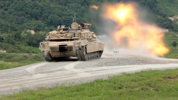 A M1A2 tank belonging to B. Co., 1st Battalion 12th Cav. Regt., 3rd Armored Brigade Combat Team, 1st Cavalry Division, fires from a support by fire position during combined arms breach training here Sept. 3-7. The training included allied units from the ROK Army as well as enablers including fires, air support and engineers.