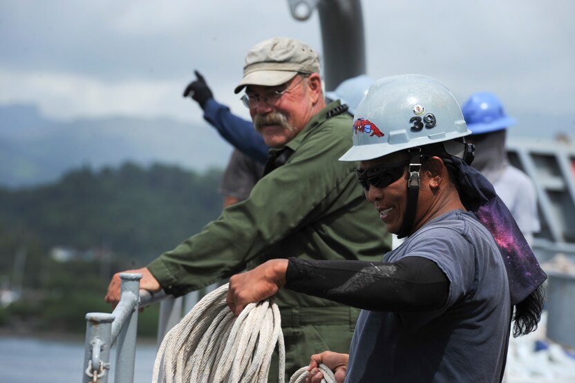 Able Seaman Genaro Cuico, a Military Sealift Command civilian mariner assigned to the submarine tender USS Emory S. Land (AS 39), prepares to toss a line to the pier as the ship prepares to moor at Subic Bay, Philippines, Nov. 18. Land is in Subic Bay for a scheduled port visit to conduct a series of inspections for Land's Fleet Maintenance Activity Assessment.