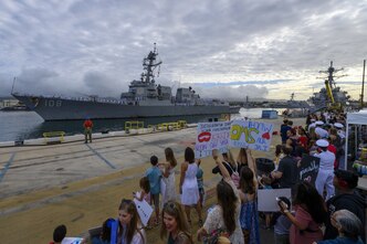 Families and friends welcome the Arleigh Burke-class guided-missile destroyer USS Wayne E. Meyer (DDG 108) back to Joint Base Pearl Harbor-Hickam upon completing a regularly scheduled deployment. Wayne E. Meyer deployed to the U.S. 7th Fleet area of operation and conducted an assortment of operations, including several freedom of navigation operations as part of Destroyer Squadron (DESRON) 15, the Navy's largest forward-deployed DESRON and the U.S. 7th Fleet's principal surface force.
