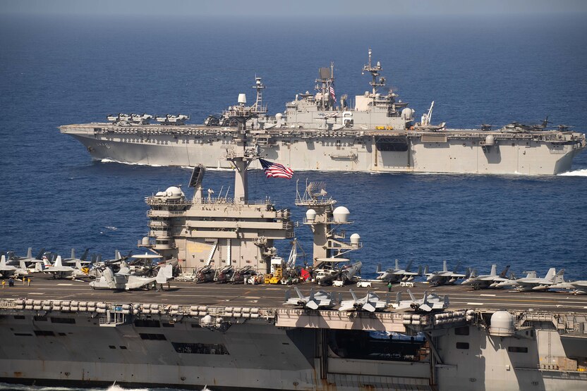The aircraft carrier USS Theodore Roosevelt (CVN 71) and the amphibious assault ship USS America (LHA 6) transit the Pacific Ocean Feb. 15, 2020. Operating as an Expeditionary Strike Force, the Navy-Marine Corps team integrates carrier strike group combat power with the flexible capability of an expeditionary strike group to provide the fleet commander with a capable, credible combat force that can be deployed anywhere in the world. (U.S. Navy photo by Mass Communication Specialist 2nd Class Anthony J. Rivera)
