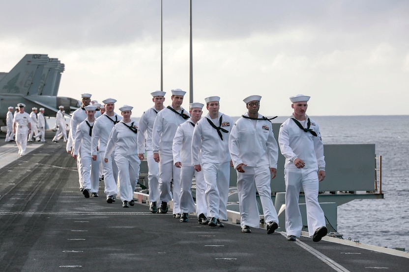 Sailors man the rails of the aircraft carrier USS Abraham Lincoln (CVN 72) as the ship prepares to pull into Joint Base Pearl Harbor-Hickam for a scheduled port visit, Jan 8, 2020). The Abraham Lincoln Carrier Strike Group is deployed to the U.S. 3rd Fleet area of operations in support of security and stability in the Indo-Pacific region. With Abraham Lincoln as the flagship, deployed strike group assets include staffs and aircraft of Carrier Strike Group (CSG) 12, Destroyer Squadron (DESRON) 2 and Carrier Air Wing (CVW) 7.