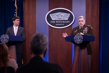 Secretary of Defense Dr. Mark T. Esper and Chairman of the Joint Chiefs of Staff Gen. Mark A. Milley host a Press Briefing on DOD support to COVID-19 response in the Pentagon Briefing Room April 14, 2020.