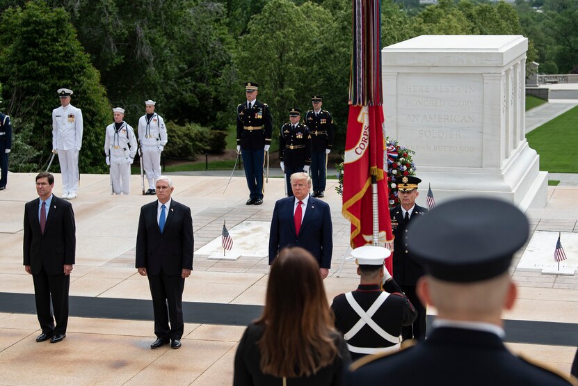 The Honorable Donald J. Trump, 45th President of the United States, The Honorable Michael R. Pence, 48th Vice President of the United States, The Honorable Mark T. Esper, 27th Secretary of Defense, and Maj. Gen. Omar J. Jones IV, commanding general, Joint Force Headquarters-National Capital Region and the U.S. Army Military District of Washington, participate in the 152nd National Memorial Day Presidential Armed Forces Full Honor Wreath Ceremony to honor America’s fallen military service members, May 25, 2020 at Arlington National Cemetery.