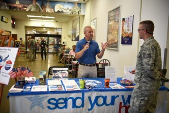 James Brady, 14th Force Support Squadron community readiness specialist and installation voting assistance officer, talks with Air Force Staff Sgt. Cory Henning, 14th Civil Engineer Squadron, during Armed Forces Voters Week in the base exchange on Columbus Air Force Base, Miss., June 27, 2018. Though federal election years have a large effect on the voting community and activity, elections are happening across the country every year.