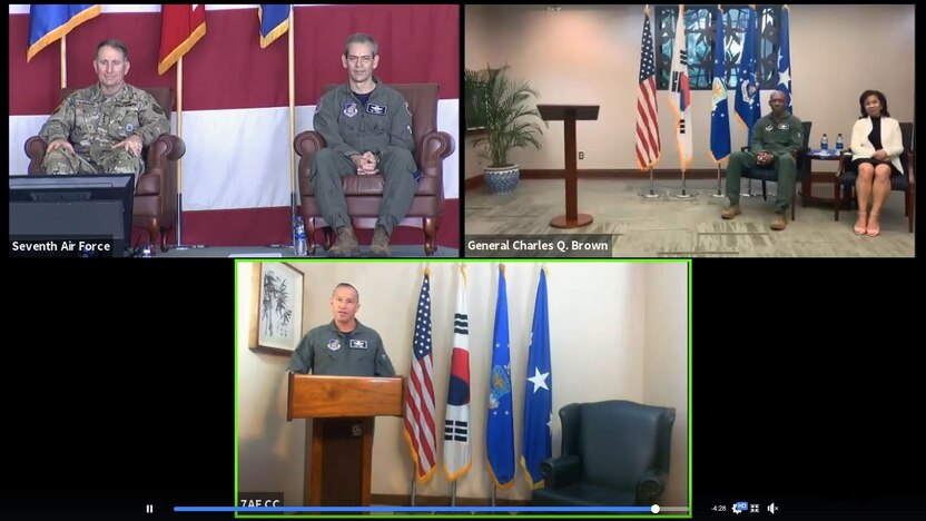Lt. Gen. Scott L. Pleus, Seventh Air Force commander, gives a virtual speech as Gen. Robert “Abe” Abrams, Commander, United Nations Command/Combined Forces Command/United States Forces Korea, Lt. Gen. Kenneth S. Wilsbach, Gen. CQ Brown, Jr., Commander, Pacific Air Forces, and audience members online and at the ceremony at Osan Air Base, ROK, listen June 12, 2020. Pleus assumed command of the Air Component Command and Seventh Air Force and assumed responsibility as the deputy commander of United States Forces Korea.