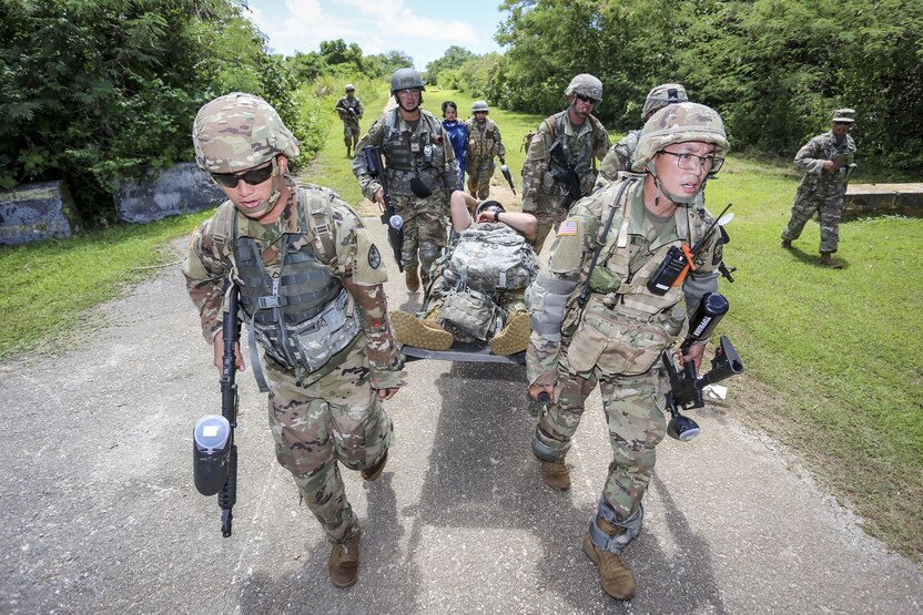 Officer candidates from the Guam National Guard, and ROTC Cadets from the University of Guam, train together in Barrigada on June 17. The joint exercises mark the first coordinated training effort between the two commissioning sources in over 10 years.