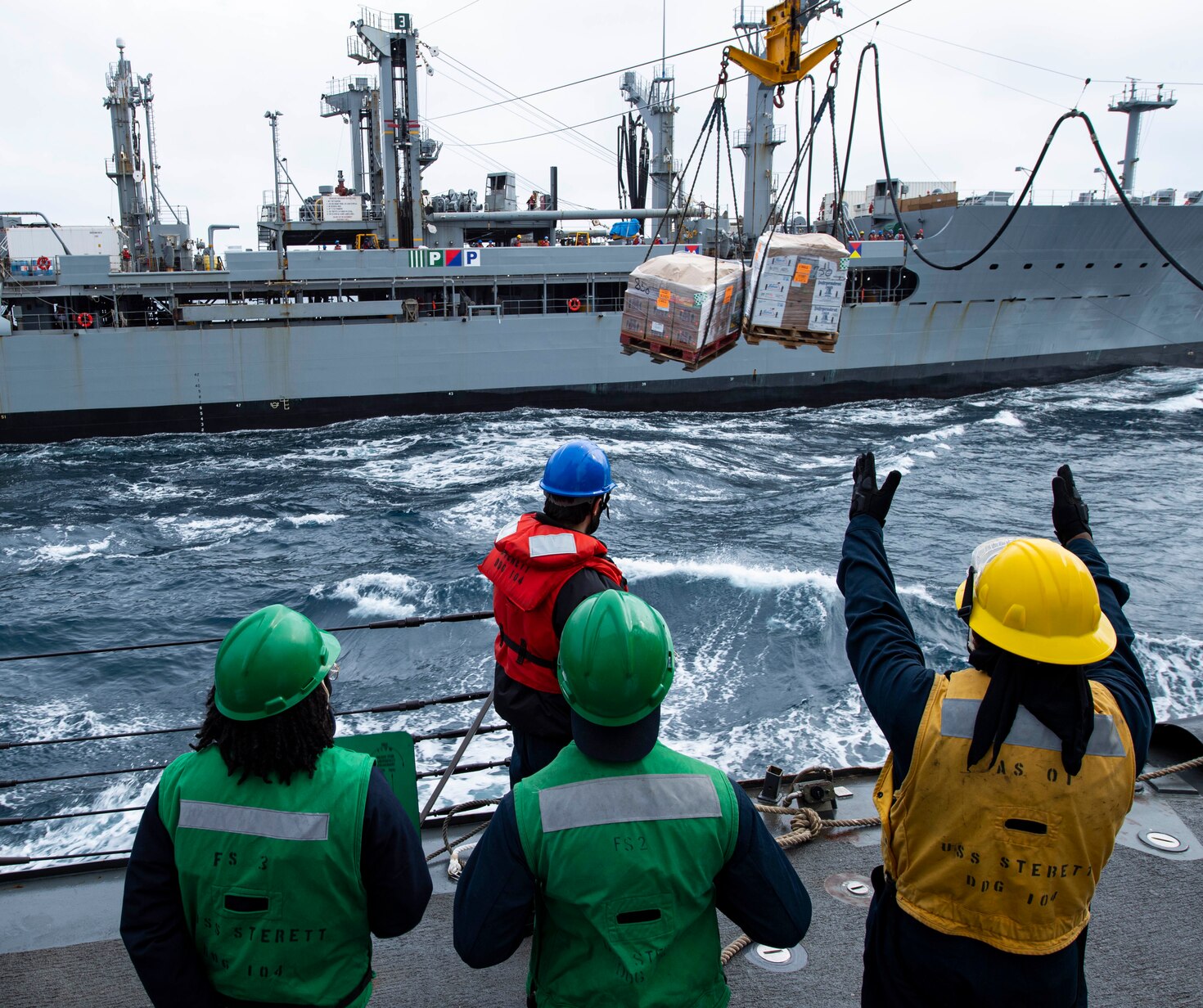 Sailors assigned to the Arleigh Burke-class guided-missile destroyer USS Sterett (DDG 104) monitor the trolley carrying supplies during a replenishment-at-sea with the Military Sealift Command fleet replenishment oiler USNS Henry J. Kaiser (T-AO 187) during a composite training unit exercise (COMPTUEX) as part of the Nimitz Carrier Strike Group (CSG). COMPTUEX is an intensive exercise designed to fully integrate units of the CSG, while testing its ability as a whole to carry out sustained combat operations from the sea.
