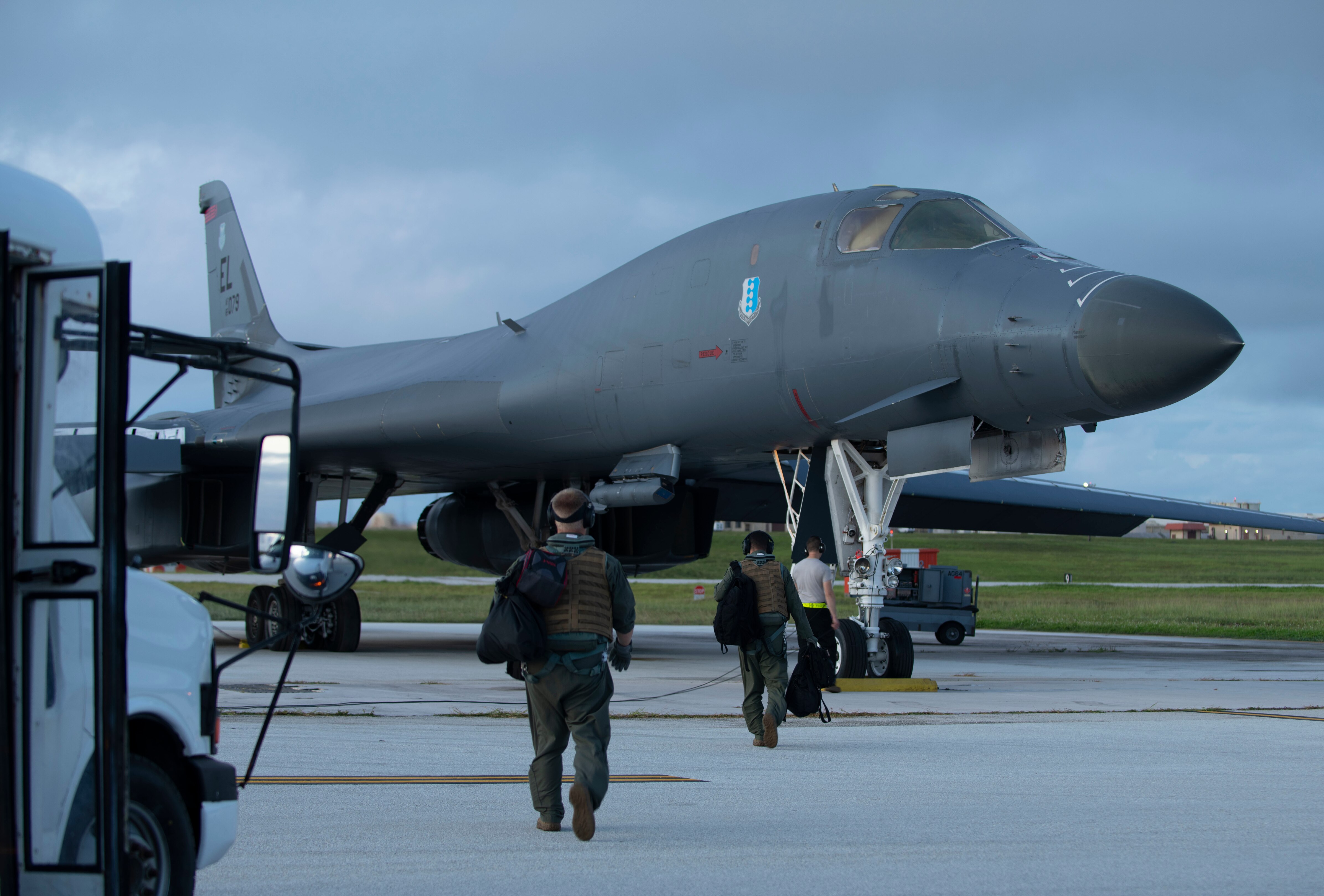 Aircrew, assigned to the 37th Expeditionary Bomb Squadron, prepare to board a B-1B Lancer at Andersen Air Force Base, Guam, prior to a Bomber Task Force mission in the South China Sea, July 21, 2020. Long range, long duration missions demonstrate the U.S. Air Force’s unwavering commitment to our allies and partners in the Indo-Pacific region.