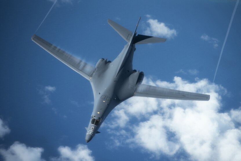 A 28th Bomb Wing B-1B Lancer, from Ellsworth Air Force Base, S.D., conducts aerial refueling with a 909th Aerial Refueling Squadron KC-135 Stratotanker, from Kadena Air Base, Japan, during a Bomber Task Force (BTF) mission July 27, 2020. The BTF missions are intended to demonstrate U.S. commitment to the collective defense of the U.S. Indo-Pacific Command theater and are a visible demonstration of the U.S. capability of extended deterrence.