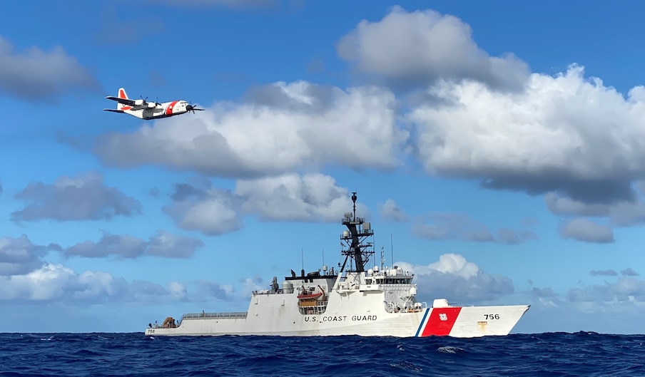 The crews of the Coast Guard Cutter Kimball (WMSL 756) and an Air Station Barbers Point HC-130 Hercules airplane conduct joint operations in the Pacific August 14, 2020. The crews were participating in the multi-country maritime Operation Nasse designed to prevent Illegal, unregulated or unreported (IUU) fishing in Oceania.