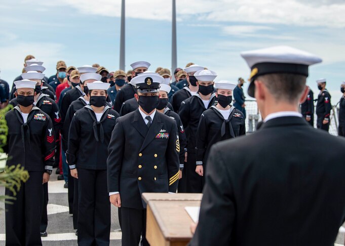 Cmdr. Mark W. Lawrence, right, commanding officer of the Arleigh Burke-class guided-missile destroyer USS Paul Hamilton (DDG 60) speaks during a Battle of Leyte Gulf commemoration ceremony. Paul Hamilton is underway conducting operations in support of security and stability in the Indo-Pacific while assigned to Destroyer Squadron (DESRON) 15, the Navy’s largest forward-deployed DESRON and the U.S. 7th Fleet’s principal surface force.