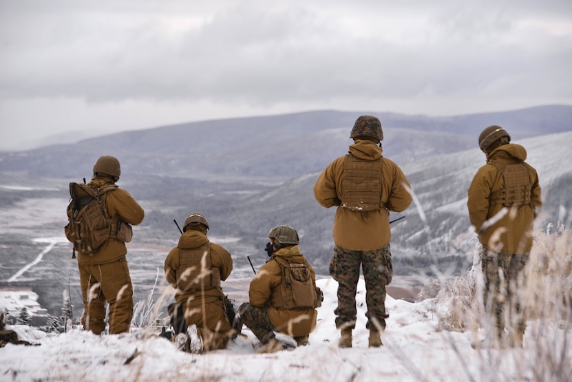 U.S. Marines assigned to the 1st Air Naval Gunfire Liaison Company (ANGLICO) stand by for orders during RED FLAG-Alaska 21-1 in the Joint Pacific Alaska Range Complex, Oct. 15, 2020. The 1st ANGLICO provides direct support to the various joint, allied, coalition and special operations forces working within Marine Corps battlespace.