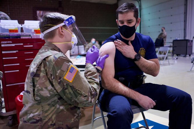 Alaska Army National Guard Spc. Alexander Martin-Frank, a combat medic with the Alaska Army National Guard Medical Detachment, administers the first dose of the COVID-19 vaccine Jan. 24, 2021, to Capt. Michael Lopez, staff officer with 1st Battalion, 297th Infantry Regiment, at Joint Base Elmendorf-Richardson. In his full-time job, Lopez is a Wasilla Police Department police officer, and he came straight from work to get the vaccine.